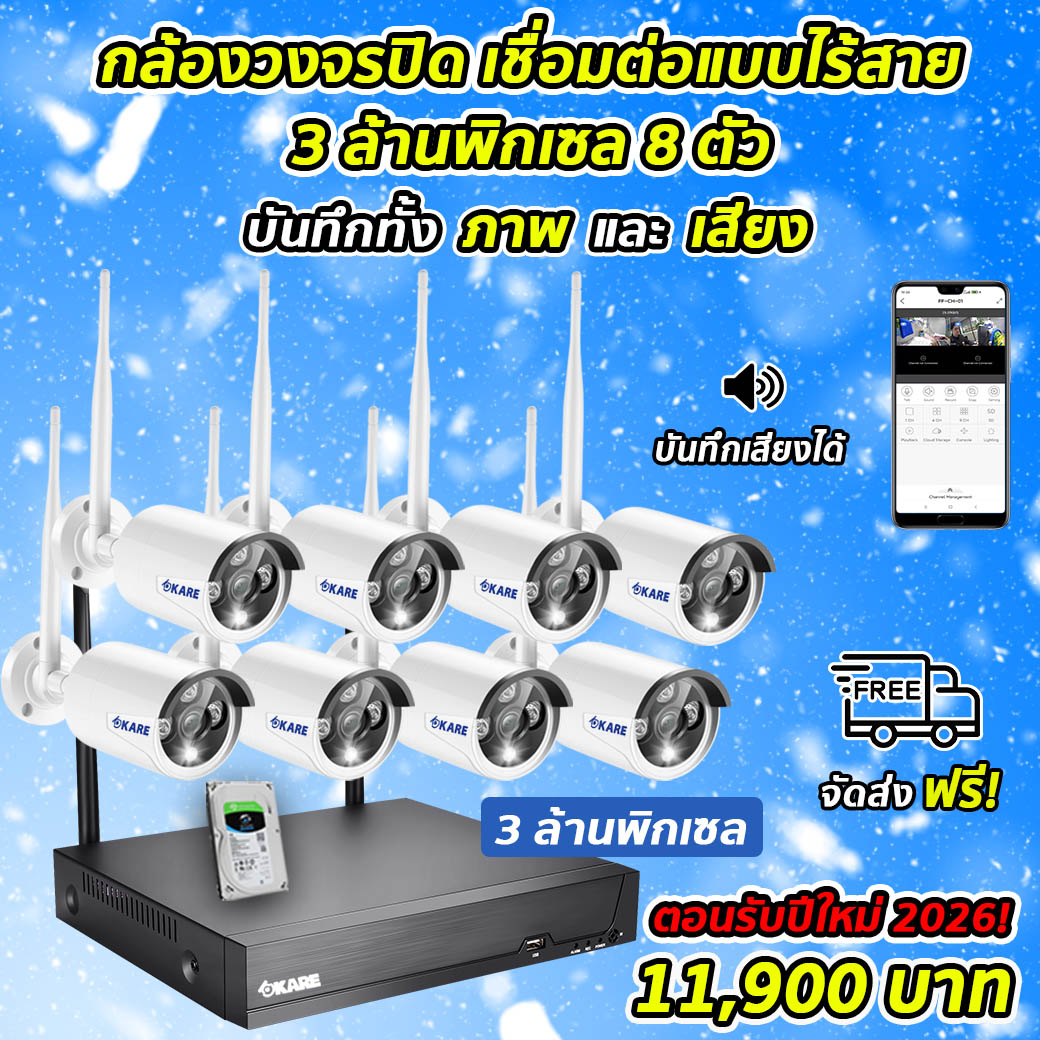 กล้องวงจรปิด Wi-Fi KARE 3 ล้านพิกเซล 8 ตัว ชุดติดตั้งเอง